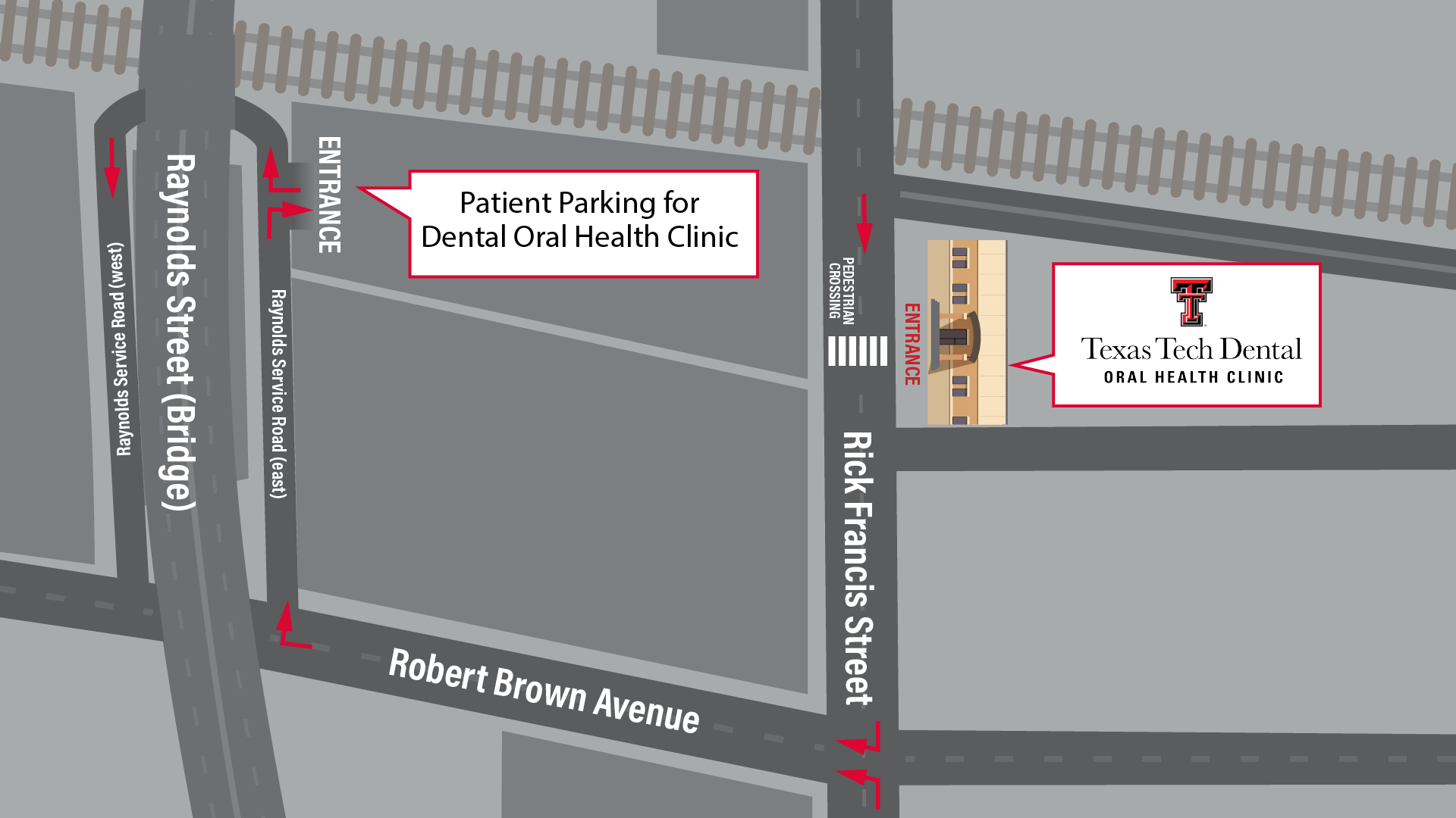 - OHC Patient parking entrance is on Rick Francis Street, with the exit on Raynolds Street.